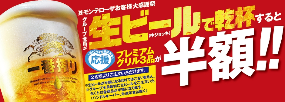 「白木屋」「魚民」「笑笑」などの居酒屋を全国に展開する株式会社モンテローザ(本社:東京都武蔵野市、代表取締役:大神 輝博)は、令和2年8月6日から9月30日までの約2ヶ月間、当社グループ店舗の内、約1,420店舗で、ご利用人数分の「生ビール(※1)」を最初にご注文いただき、乾杯をしていただいたお客様を対象(グループも対象)に、「プレミアムグリル(※2)」などの特別メニューを半額で提供するキャンペーン「お客様大感謝祭 第2弾」を開催します。