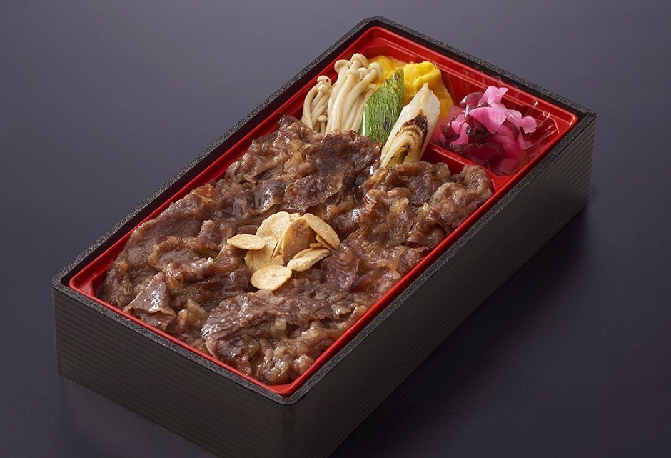 牛バラ肉をガーリック風味の甘辛ダレで焼き、ご飯に敷き詰めたスタミナ満点のお重。