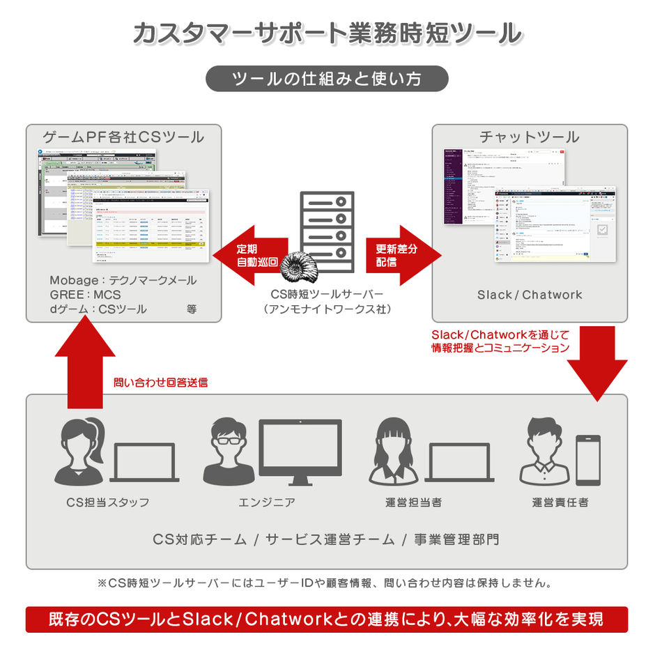 アンモナイトワークスでは、本ツールの普及により、ソーシャルゲームプロバイダー各社のCS業務の効率を改善し、ゲーム業界全体の生産性の向上と「働き方改革」に貢献してまいります。