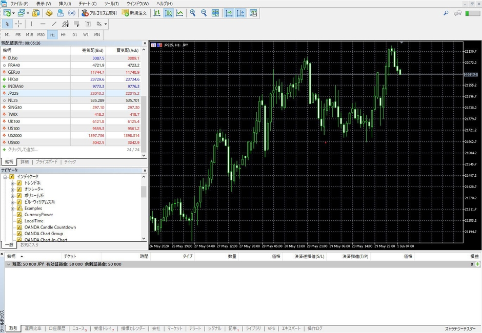 また、取引単位は0.01と一般的なCFD取引よりも細かいロット数でお取引いただけるので、少額からの取引(日経225の取引を行うJP225の場合、0.01単位で注文が可能なため、必要な証拠金は20円程度から)も可能です。