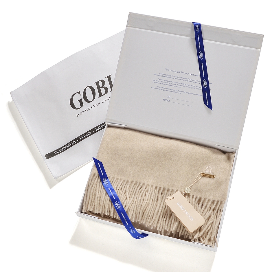 本製品はGOBI CASHMEREのオーガニックレーベル「GOBI ORGANIC」のストールです。「GOBI ORGANIC(ゴビオーガニック)」は、染色や漂白をしていないオーガニックカシミヤを使用し、天然色であるオフホワイト、ベージュ、ウォームグレー、ブラウンの4色で展開するコレクション。身体に優しい、地球に優しい素材で、心地良さに包まれることでありのままの自分でいられます。そのナチュラルなテイスト、トレンドに惑わされないクラシックなスタイルは、海外でも大変高く評価されています。