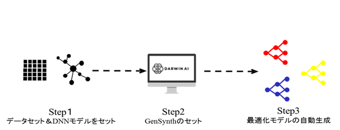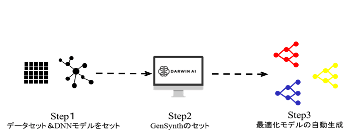 GenSynthは、顧客企業が持つDNNモデルとデータセットをGenSynthへセットするだけで、GenSynth内にあるAIが最適化されたDNNモデルを自動生成します。