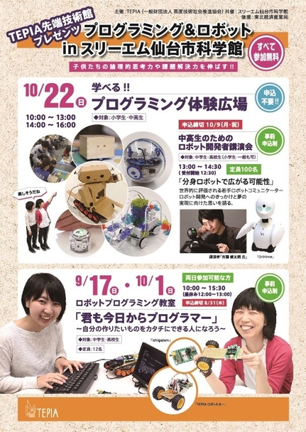 TEPIA先端技術館では、今秋、新たな取り組みとして、スリーエム仙台市科学館において「TEPIA プログラミング&ロボット inスリーエム仙台市科学館」を開催します。「プログラミング」「ロボット」をテーマにしたイベントを開催し、子供たちの論理的思考力や課題解決力の育成につなげます。