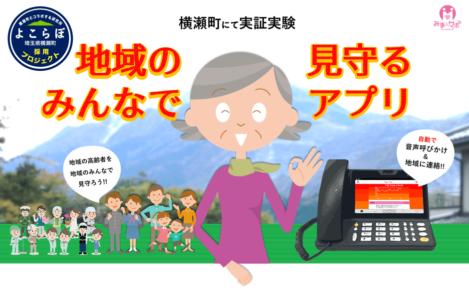 アプリ開発技術・原体験をもつリバティ・イノベーションと、情報通信機器の開発・製造・販売を行い高齢者に優しい電話機型端末「AIO-51」※1を販売するナカヨの2社が協力し、横瀬町が運営する「人口減少に立ち向かうために、企業や個人から新しい事業・研究・企画などを町に呼び込む仕掛け、官民連携プラットフォーム『横瀬町とコラボする研究所』通称“よこらぼ”」を通じて、横瀬町に住む高齢者を対象に見守りサービスアプリ「みまサポ」の有用性・課題抽出を目的とした実証実験を行います。