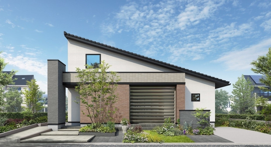 空に向かって伸びる大屋根のシルエットが、大らかさを演出するモダンデザイン。ファサードのアクセントタイルや大型ルーバーが住まいに程よいアクセントを付け、外観をモダンに演出します。