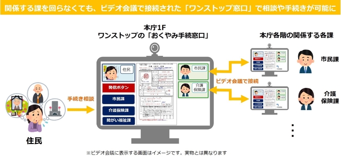 本事業では、亡くなった住民の方に関する様々な手続きを対象とし、今回新設する「おくやみ手続窓口」と手続きに関係する各課をビデオ会議システムでつなぐことで、スムーズな「ワンストップ窓口」の実現を目指します。