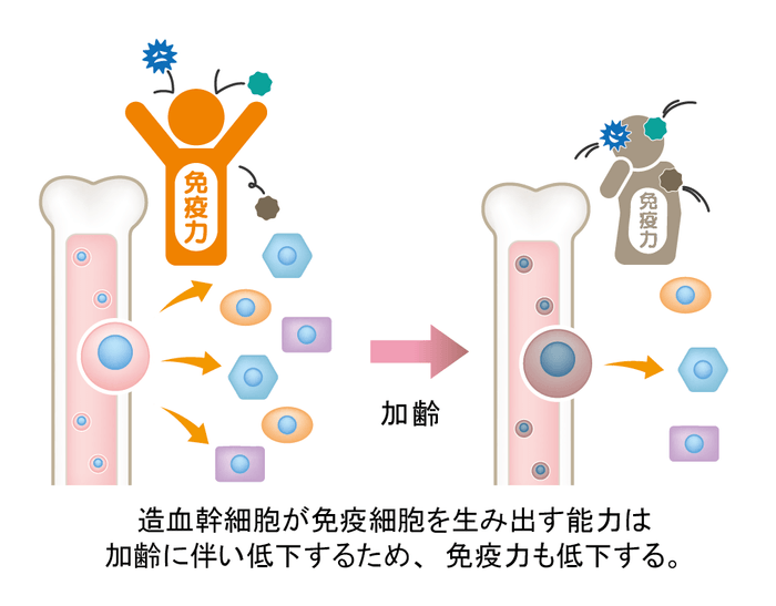 造血幹細胞は骨髄に存在し、B細胞、T細胞、NK細胞などの免疫細胞を含むすべての血液の細胞を生み出す幹細胞です。しかし、加齢とともにこの血液の細胞を生み出す働きが低下します。その結果、免疫細胞の供給も減り、免疫力が低下すると考えられています。免疫力を向上させるには、造血幹細胞の働きを高めることが重要です。