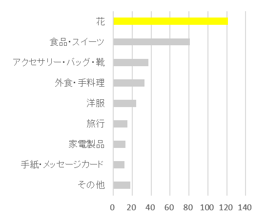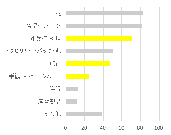 一方、女性に対して、母の日に男性から何をプレゼントされたいか質問したところ、「花」、「食品・スイーツ」が人気ながらも、「外食・手料理」、「旅行」、「手紙・メッセージカード」を選ぶ方が、男性への質問に比べて多くいることがわかりました。