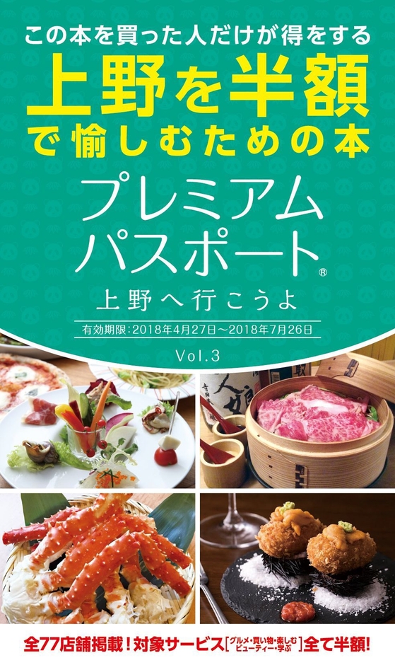 株式会社アプローチ・ハル(所在地:東京都足立区、代表取締役社長:下川 高志)は、パンダのシャンシャン誕生および国内外からの観光客で沸く上野エリアにおいて、地域企業と消費者が繋がる体験型書籍「プレミアムパスポート~上野へ行こうよ~Vol.3」を2018年4月27日に発売します。本書は掲載店舗数77店舗、総額30万円以上のプレミアム体験。従来の情報を伝えるグルメ・ガイド本とは異なり、読者のお得感はまさにプレミアム。この本を買った人だけが得をする、対象サービスの全てが半額以下のスペシャルクーポンブックです。
