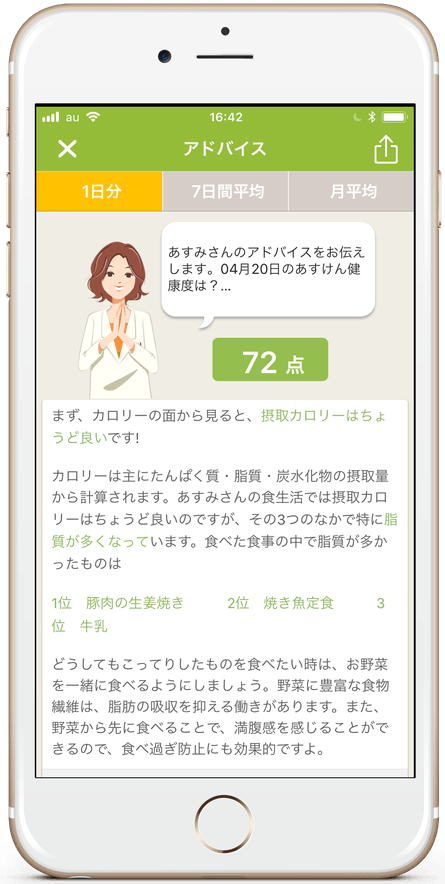 あすけんは、食事写真を投稿するだけで食事のカロリーなど14種類の栄養素を解析し、その結果から管理栄養士のノウハウがつまった改善アドバイスが得られるアプリです。栄養士からのアドバイスは、独自のアルゴリズムで自動に生成され、そのパターンは20万通り以上。毎日の食事に対応したパーソナルアドバイスをお届けします。
