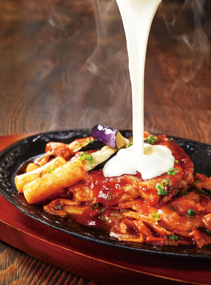 コチュジャンやヤンニョンジャンなど4種の醤で深みをだした旨辛ダレに絡めて焼いた、柔らかくジューシーなチキンとたっぷりの野菜に、チェダー・ゴーダ・パルメザン・エメンタールをブレンドした濃厚なチーズソースを絡めて召し上がっていただく、デニーズ風チーズタッカルビです。あつあつの鉄板からわきたつ香りに食欲が刺激される、この冬一押しの一品です。