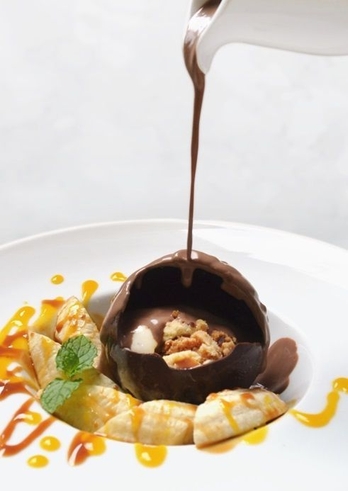フランス語で「なだれ」を意味する「アヴァランシュ」は、冷たいバニラ アイスクリームとクランブルが入ったボール状のショコラに、温かいショコラ ショーをかけていただくという、ドゥバイヨルならではのユニークなコンセプトのもと、オリジナル レシピとして誕生したデセール メニューです。