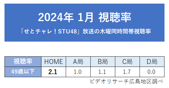 【せとチャレ!STU48】2024年1月・月間視聴率 49歳以下1位