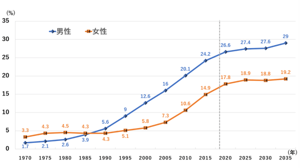 生涯未婚率とは、50歳時点で1度も結婚をしたことのない人の割合。2010年までは「人口統計資料集(2015年版)」、2015年以降は「日本の世帯数将来推計」より、45~49歳の未婚率と50~54歳の未婚率の平均。