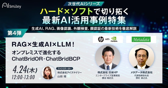 AIポータルメディア「AIsmiley」を運営する株式会社アイスマイリー(東京都渋谷区、代表取締役:板羽晃司)は、日本HPと最先端のAI企業を迎え、2025年4月17日(木)、2025年4月22日(火)~年4月24日(木)全4回開催の【次世代AIシリーズ】ウェビナーを開催します。