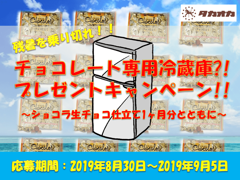 高岡食品工業株式会社(本社:兵庫県尼崎市、代表取締役:松田 順子、以下 タカオカ)は、2019年8月30日から9月5日までの1週間、Twitter上にて「夏に食べたいチョコレート」のアイデアをご提供頂いたお客様の中から抽選で1名様に、チョコレート専用冷蔵庫とヒット商品「ショコラ生チョコ仕立て」1ヶ月分をプレゼントする「チョコセラーキャンペーン」を開催いたします。