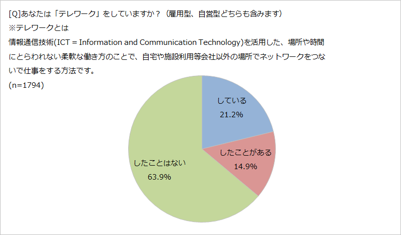 就労者のうち、テレワーク経験者は20.7%という結果でした。