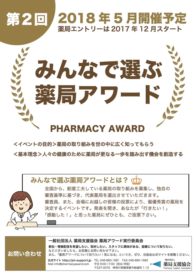 一般社団法人 薬局支援協会(所在地:神奈川県横須賀市、代表理事:竹中 孝行)は、全国の薬局から取り組みを募集し、一般の方に向けて発表、そして表彰する『第2回みんなで選ぶ 薬局アワード』に向けて、12月1日より、薬局エントリーを開始しました。
