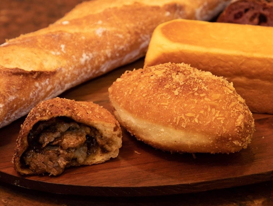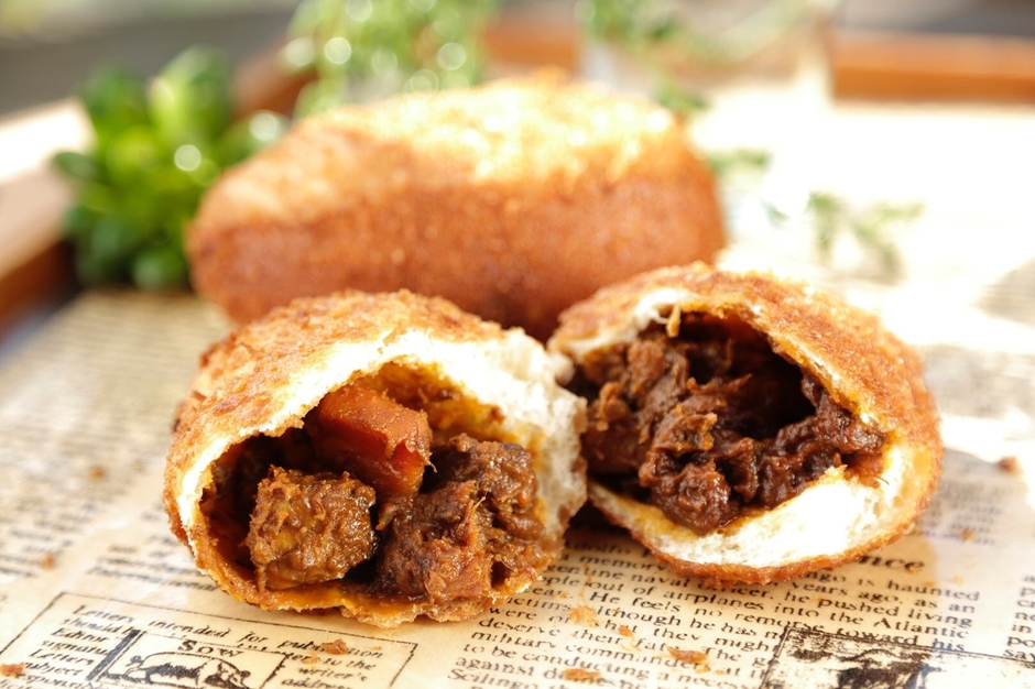 こむぎのおはなし店ではお馴染みの「牛肉ゴロゴロカレーパン」は、赤ワインでじっくり煮込んだルーとほろほろの牛肉が特徴的です。創業当時より試行錯誤を繰り返し開発されたカレーパンは、パンパティの代名詞でもあります。