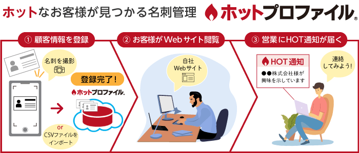 「ホットプロファイル」に顧客情報を登録しておくと、自社Webサイトを閲覧して興味を示している“ホットなお客様”を自動でお知らせしてくれる機能です。「ホットプロファイル」では営業担当者がかんたんに利用できることが重要だと考え、営業担当者の作業はスマホアプリで名刺を撮影するだけで「HOT通知」を受け取れるようになります。