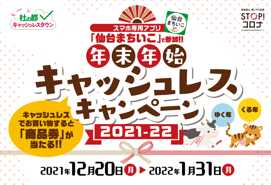 仙台商工会議所(所在地:仙台市青葉区本町2-16-12、会頭:鎌田 宏)では、長期化する新型コロナウイルス感染症の影響により、街での買い物マインドの低下が顕著となっている中、現在開催中の年末お客様感謝祭から仙台初売り期間に合わせて、これら既存イベントに加え、さらなる商店街の販売促進、街の回遊性につなげるとともに、キャッシュレスの推進を図ることで、便利でコロナ禍でも安心・安全な決済手段の利用拡大を目指し「年末年始キャッシュレスキャンペーン」を実施します。