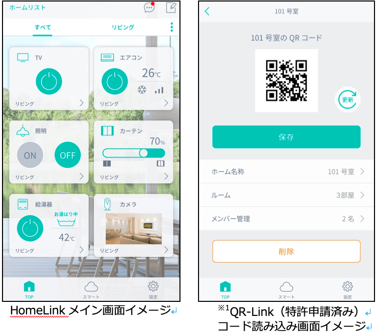 まず1つに※1「QR-Link(キューアールリンク)」という機能です。これは特許申請済みの日本初の技術で、QRコードを読み込むだけで(事前設定が必要)、IoT製品の一括操作と管理を可能にします。最先端技術で付加価値をつけ差別化を図ることができるとされ、特に不動産業界やホテル業界との取引を中心に想定している技術です。