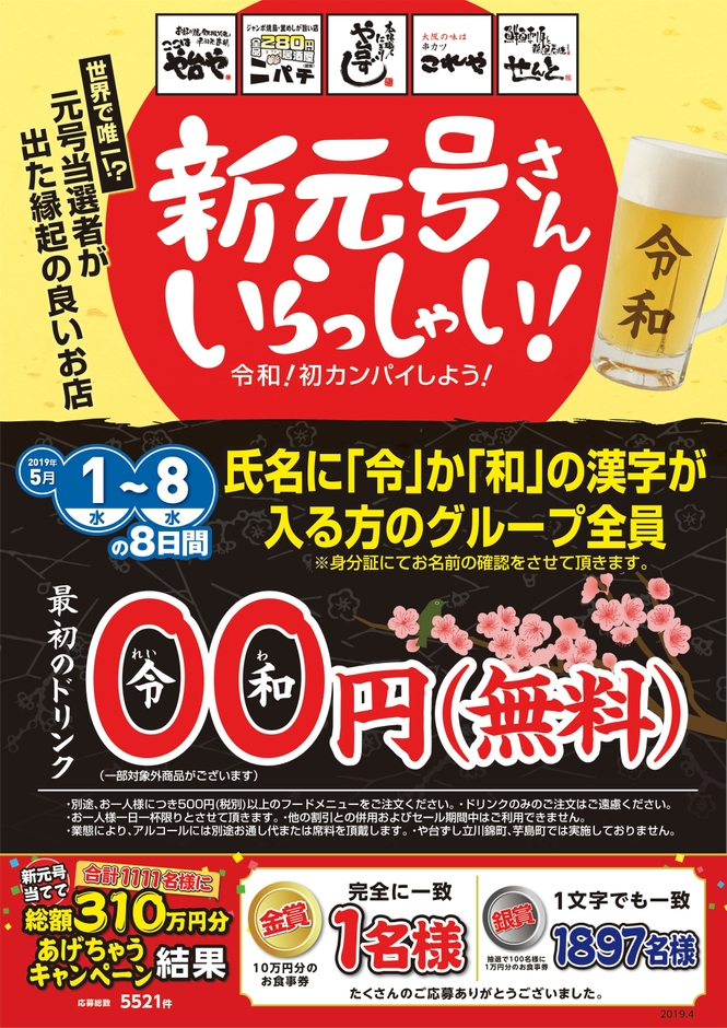 それとともに、このキャンペーンで新元号「令和」の的中者が出た事は、当社にとっても非常に縁起が良いありがたい事だと考え、お客様に新元号での初カンパイを、ヨシックスのお店でして頂きたく、下記キャンペーンを実施することと致しました。