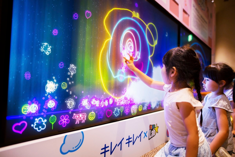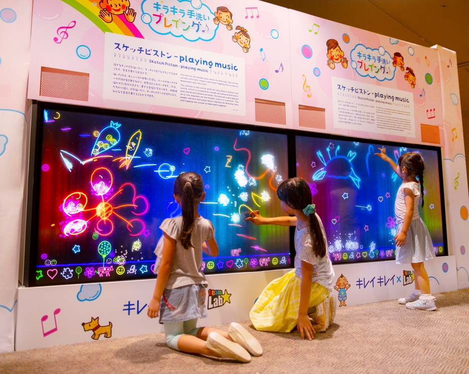 チームラボ、指で描いて音楽を奏で、世界を創る「スケッチピストン」を広島で開催の「チームラボ 学ぶ!未来の遊園地と、花と共に生きる動物達」、キレイキレイブースにて展示。2019年7月27日(土)から。