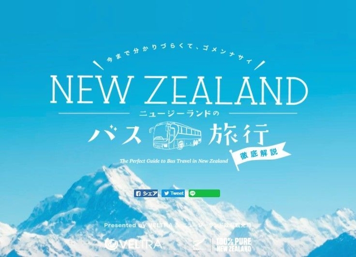 世界各地の現地オプショナルツアー専門予約サイト『ベルトラ』を運営するベルトラ株式会社(本社:東京都中央区、代表取締役社長:二木 渉、以下「ベルトラ」/ https://www.veltra.com/jp )は、2018年1月15日(月)に、ニュージーランド政府観光局協賛のもと、ニュージーランド国内のバス移動での観光の楽しみ方を伝える特集サイト「今まで分かりづらくて、ゴメンナサイ ニュージーランドのバス旅行 徹底解説」を公開しました。