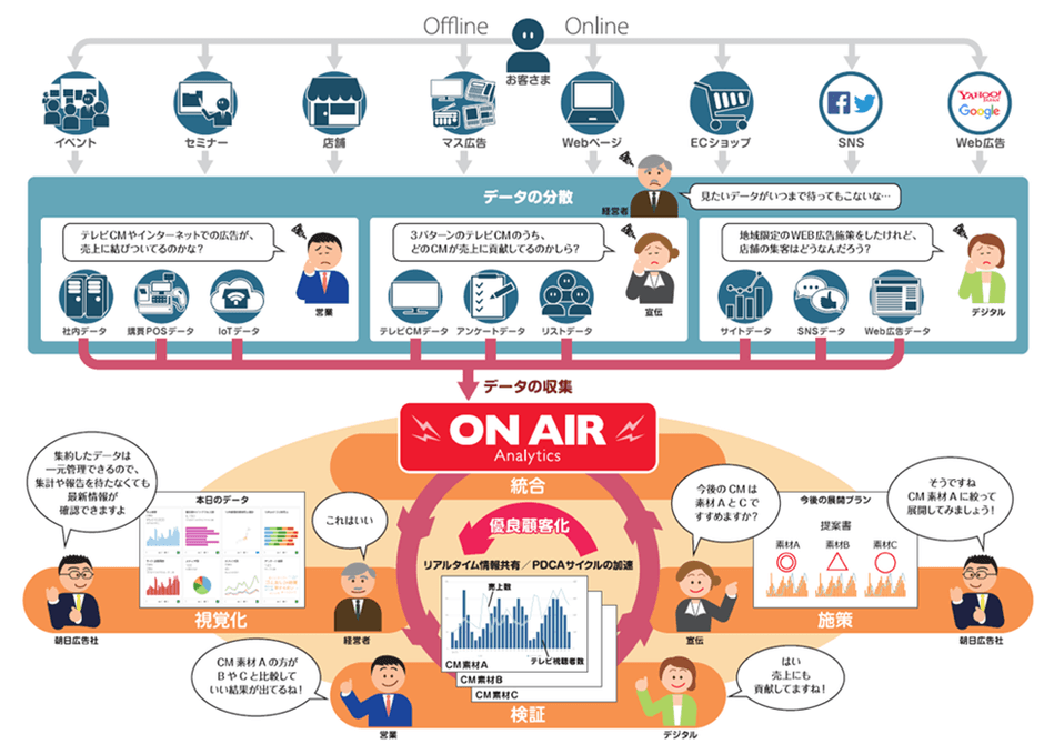 株式会社朝日広告社(本社:東京都中央区、代表取締役社長:上田 周)は、散在するビジネスデータの管理・分析方法に変革をもたらし、マーケティング施策の効果をリアルタイムに共有できる新たなツールとして、CMO・部門長・マーケターなどに向けてクラウド型統合マーケティング管理プラットフォーム「ON AIR Analytics(オン・エアー・アナリティクス)」を開発し、実証を経て発表いたします。