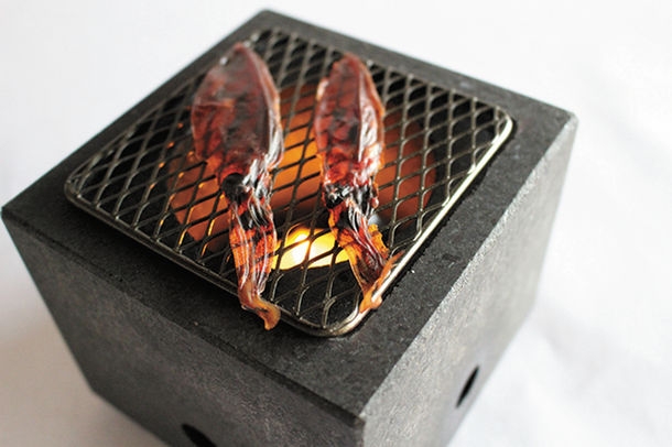 炙り鉢の素材である御影石には遠赤外線効果があり、食べ物を芯から温め、ふっくら、ほくほくにしてくれます。おつまみの種類は白えび燻製、げんげ塩バジル、墨干し、ほたるいかたまり干し、ほたるいか素干し。日本酒はもちろん、ワインにもぴったりのラインナップです。