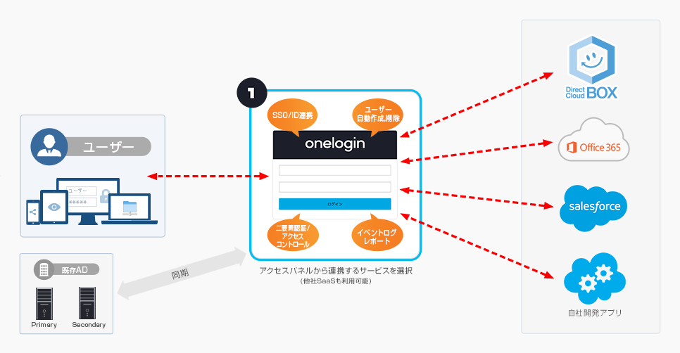 シングルサインオンを利用することで、DirectCloud-BOXへログイン時に、DirectCloud-BOXのID・パスワードを入力する代わりに、OneLogin経由でのログインが可能となります。DirectCloud-BOXでは、Azure ADやG Suite、OneLoginなどSAML 2.0に対応したIDaaS(※3)をご利用いただけます。