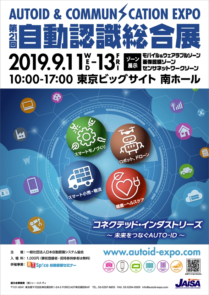 一般社団法人日本自動認識システム協会(通称:JAISA[ジャイサ]、所在地:東京都千代田区、会長:池田 隆之)は、2019年9月11日(水)~13日(金)の3日間、東京ビッグサイト(東京国際展示場)南ホール4Fにて、「第21回自動認識総合展 AUTOID & COMMUNICATION EXPO 2019」を開催いたします。また、併設で「自動認識セミナー(Business Technology Spice)」を開催いたします。