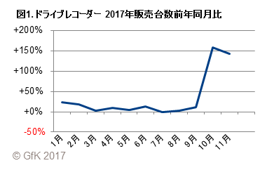 全国のカー用品量販店、家電量販店、GMS、インターネット通販における2017年のドライブレコーダーの販売台数は、9月までは前年をわずかに上回る程度で推移していたが、10月は前年同月の2.6倍、11月は2.4倍と急伸した(図1)。危険運転が発端とされる事故の報道によって、自衛手段としてのドライブレコーダーの有効性が広く認識されるようになったためだ。