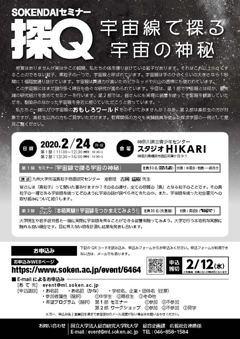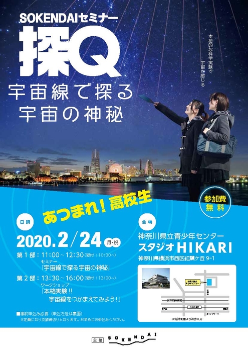 2020年2月24日(月・祝)、SOKENDAIセミナー「探Q 宇宙線で探る宇宙の神秘」を神奈川県立青少年センター スタジオHIKARI(神奈川県横浜市西区紅葉ケ丘9-1)にて開催いたします。