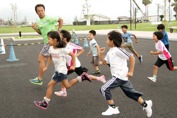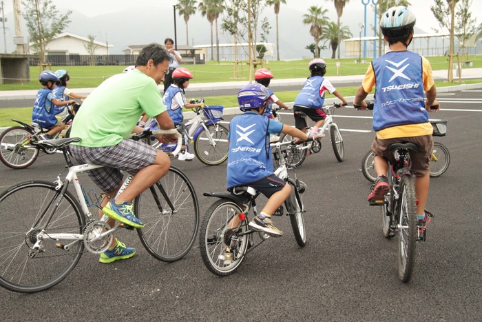 第1回の「正しい走り方と自転車の乗り方」体験会には尾道市立瀬戸田小学校の1年生から6年生の9人が参加しました。講師に湘南ベルマーレトライアスロン部監督中島靖弘氏を招き、走り方と自転車の基礎を学びました。走り方の基礎は、腕の角度、振り方、ももあげ、などを学び、自転車の基礎では、乗車前の点検、交通マナー、バランスのとり方、曲がり方、止まり方を学び、最後に敷地内のコースでランとバイクを順に行う、ショートバージョンのデュアスロン競技を行いました。