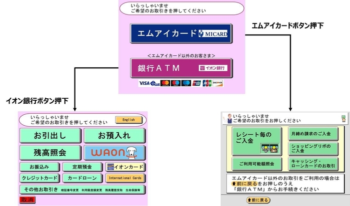 今後、全国の三越伊勢丹グループ百貨店に設置されているエムアイカードのATMが共同ATMとなり、両社が各々提供しているサービスの全てのメニューが1台のATMで利用可能となります(操作画面イメージは※参照)。今回の共同ATMサービスの提供は、イオン銀行とエムアイカードがATM運営の効率化を図りつつ、百貨店に来店されたお客様の幅広いニーズに応えられるようにするものです。