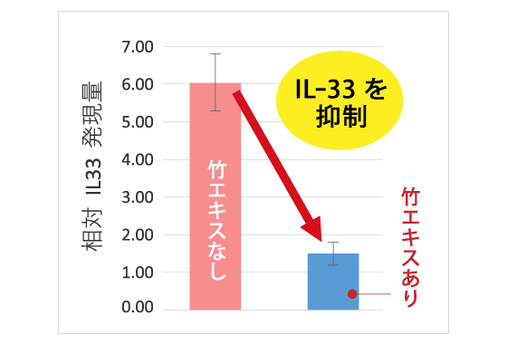 粉砕した竹をそのまま溶媒に浸して抽出したエキスには特に効果は認められませんでした。そこで、竹にさまざまな前処理を行ったうえで抽出を試みたところ、粉砕した竹を70℃で焙煎しさらに天日乾燥し、30℃の環境下で抽出したところ、エキスに明らかな臨床的な効果を感じるに至りました。そして、ヒト表皮角化細胞を用いたIL-33の発現抑制効果を測定したところ、IL-33の発現を大幅に抑制する結果が得られました。