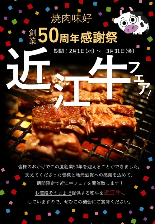 地元の皆様に支えられて創業50周年を迎えることができました。感謝の気持ちを込めて、通常価格のままで使用するお肉を「近江牛」にしてご提供するフェアを実施いたします。地元のお肉を地元の皆様に食べて頂きたいという想いを形にしましたので、滋賀県自慢の近江牛をぜひ食べに来てください。