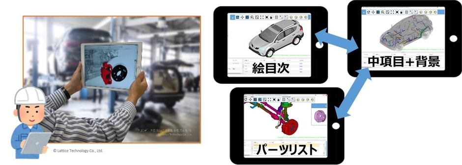 これにより、自動車や産業機械などの製品のフル3Dモデルを軽快に表示、サービスマンはタブレットで3Dのサービスカタログを参照し、故障部品を速やかに検索できます。また、サービスカタログの作成から配信までを管理する事で、サービスカタログをバリエーション毎に作成したり、容易にタイムリーな更新ができます。