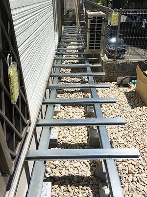 既存の基礎石だけですと耐久性にも問題があるため、基礎石を12個追加することでピッチを狭くし耐久性を向上。エス・ウッドは未利用木材と再生プラスチックをバランスよく融合した地球環境に優しい素材です。