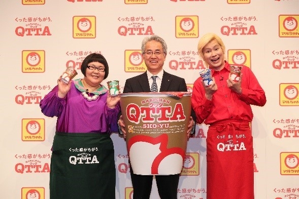 東洋水産株式会社(本社:東京、社長:今村 将也)は、全ての若手を応援するプロジェクト「QTTAエールプロジェクト」の一環として、自分だけのオリジナルQTTAが食べられる店舗「#QTTAshibuya」を3月15日(木)から4月1日(日)の期間限定で東京・渋谷にオープン。それに伴い、オープン初日の3月15日(木)10:30よりヨシモト∞ホールにて、タレントのメイプル超合金の安藤なつさんとカズレーザーさんをゲストに、「#QTTAshibuya」オープニングイベントの1日店長記者発表会を開催しました。