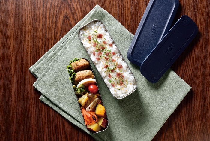 本製品は、奥行きわずか6cmのスリムでコンパクトな2段式のお弁当箱です。マチの狭いバッグにもすっきり入れられるので、学生からビジネスパーソンまで幅広い方から好評を頂いております。