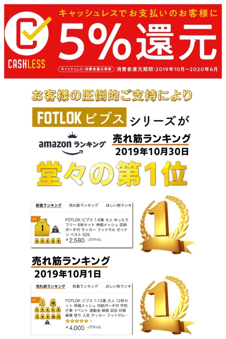 amazonランキング常連のFOTLOKビブスシリーズから『ジュニア用1~12番ナンバリングビブス 蛍光カラー全8色』がAmazonにて販売開始。キャッシュレス決済5%還元も同時開催中