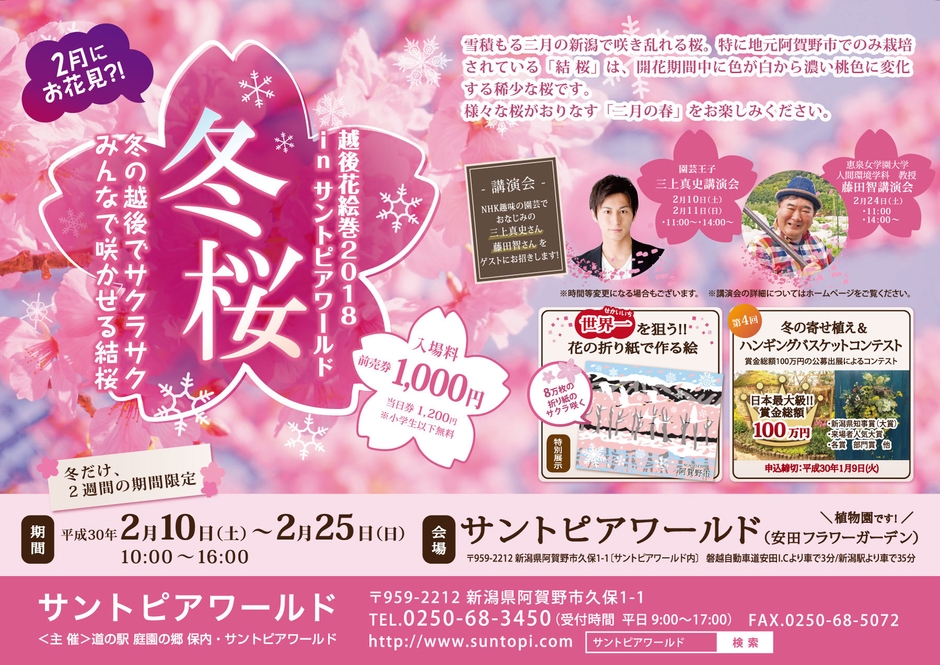 サントピアワールド株式会社(所在地:新潟県阿賀野市、代表者:佐藤 十九一)は、2018年2月10(土)~25日(日)の期間、桜をはじめとする花の祭典「越後花絵巻2018 in サントピアワールド」を開催いたします。併設された植物園を4つのエリアに分け、それぞれ「夜桜」「桜小路」「桜リゾート」「寄せ植え&ハンギングバスケットコンテスト」をテーマに展示を行います。