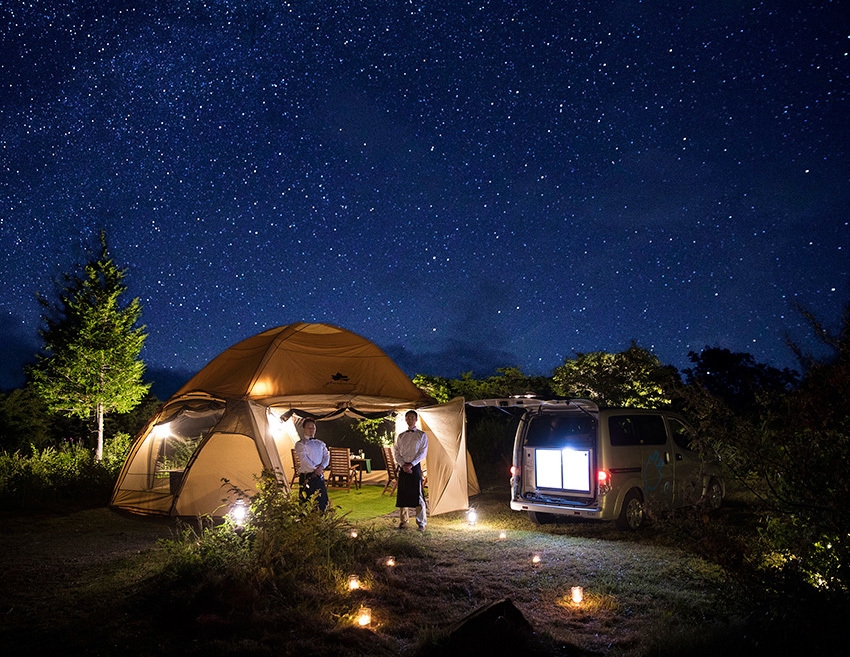 松本市乗鞍地区は、豊かな自然に囲まれた、癒しの宝庫。耳を澄ませば、風のそよぎ、虫の声、水のせせらぎが静かに聞こえてくる場所です。そんな乗鞍の会場で信州産を使った屋外ディナーを楽しむことができるのが、「アルプス山岳郷EVツーリズム 乗鞍 星と月のレストラン」。日産の電気自動車(EV)の電源を活用することで、大自然の真ん中にいながら、電気を使ったプレミアムな演出やおいしい料理を堪能できます。EVならではの静けさで自然の音がBGMとなります。暗くなれば、天候に恵まれると月光や星の瞬きが夜空を彩り、いつまでも眺めていたいほど心洗われます。自然を五感で感じながら、自然に癒されるプレミアムプランです。