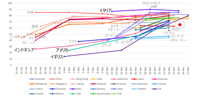他の国ではこの予防行動の実施率はおおむね高く、3月23日以降で日本より「混雑した公共の場所を避ける」実施率の低い国は、ノルウェー、フィンランド、スウェーデン、ベトナムのみでした。