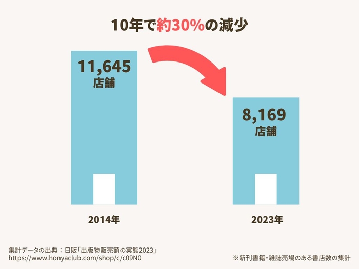 近年、町の書店が急激な勢いで数を減らしています。2014年から2023年までの過去10年間で、その数は約30%減少しました。