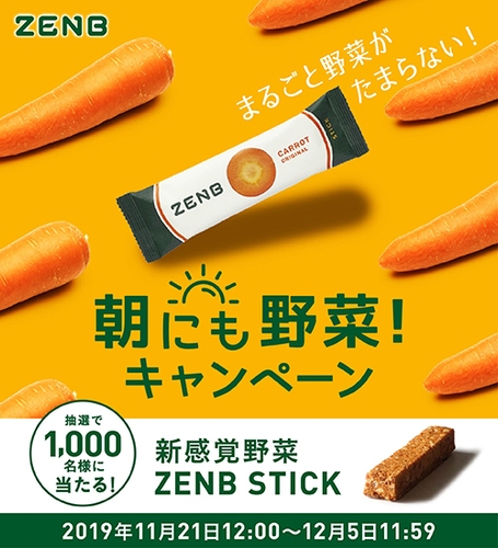ミツカングループ(愛知県半田市、以下 ミツカン)は、「ZENB」ブランドから販売している「ZENB STICK」で朝から手軽に野菜を食べることを習慣としていただくため、2019年11月21日(木)12時00分から12月5日(木)11時59分まで、「朝にも野菜!キャンペーン」を実施します。本キャンペーンにご応募いただいた方の中から、抽選で1,000名様に「ZENB STICK」2本セット(キャロット、枝豆各1本)を無料でプレゼントいたします。