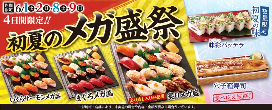 株式会社小僧寿し(東京都中央区、代表取締役・小林剛)は、6月1日(土)~2日(日)、8日(土)~9日(日)の期間、初夏のメガ盛祭を開催致します。